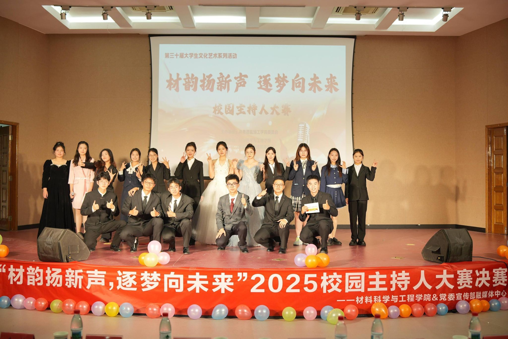 11月26日,由共青团真人赌博游戏_澳门赌博网-app*官网委员会主办,材料学院与党委宣传部融媒体中心联合承办的第三十届校园文化艺术节子项目“材韵扬新声,逐梦向未来”校园主持人大赛决赛,在知达楼五四报告厅举行。学生处副处长马晓英、校团委副书记胥爱国、材料学院党委副书记温崇明、党委宣传部网络思政科科长江莹、融媒体中心指导老师谷小川受邀担任评委,材料学院团委副书记袁梅统筹现场组织工作,全校400余名师生到场观赛。